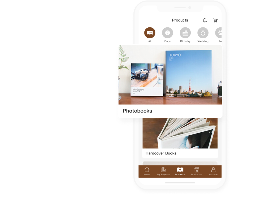 Turn your mobile photos into a photo book or photo accessories.