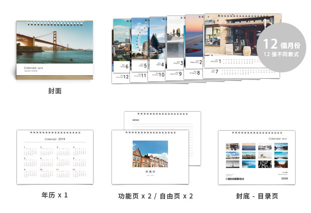 12 个月份外还有封面、年历、功能页、笔记页和目录页。